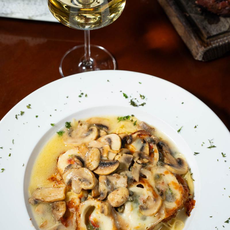 Baked parmesan encrusted breast stuffed with fresh mozzarella, spinach, roasted peppers, and prosciutto, baked and topped with sautéed capers and a mushroom white wine sauce over angel hair.