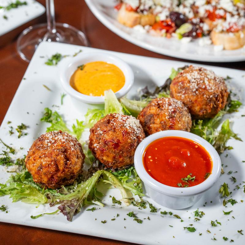 Lightly fried risotto balls stuffed with ground beef, roasted red peppers and mozzarella cheese. Served with house marinara sauce.