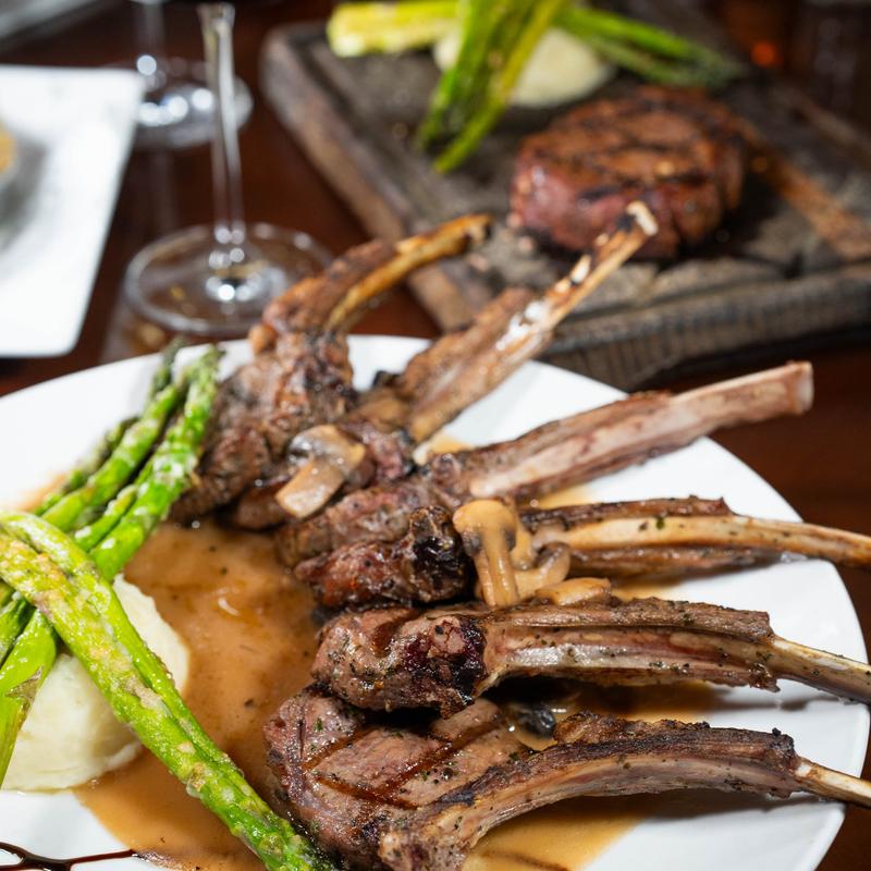 Frenched lollipops with marsala mushroom wine sauce served with asparagus and mashed potatoes.